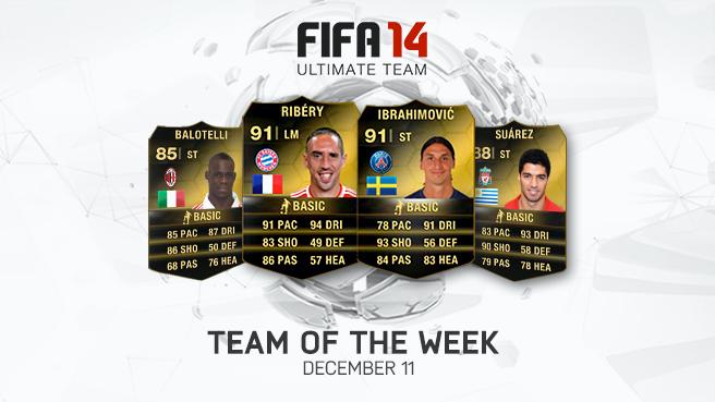 Franck Ribéry és csapata a Bayern München szombaton 7:0-val gázolt át a Werder Bremen gárdáján. Az Aranylabda egyik jelöltje két góllal és egy gólpasszal járult hozzá a sikerhez, az Electronic Arts elismerésül jövő szerdáig 91-es értékkel rejti el a FUT 14 csomagokban a játékos kártyáját. Mario Balotelli pontot mentett a Milan számára Livornóban, első góljával megszerezték a vezetést, ám a 83. percben is szükség volt a képességére, hogy végül 2:2-re tudják menteni a mérkőzést. Őt 85-ös kártyával találjuk meg. Zlatan Ibrahimović szintén két gólt lőtt a PSG színeiben a Sochaux elleni 5:0-ás diadal alkalmával. Ribéryhez hasonlóan Zlatant is 91-es kártyával tudjuk megszerezni. A legnagyobb játékot négyük közül a Liverpool csatára Luis Suárez mutatta be az elmúlt héten. Múlt szerdán 5:1-re győztek a Norwich City ellen, ebből négy gólt ő jegyez és az ötödiknek pedig ő adta a gólpaszt. Három nappal később pedig a West Ham hálójába is lőtt egyet. Az EA szakmai stábja 88-ra emelte az értékét.