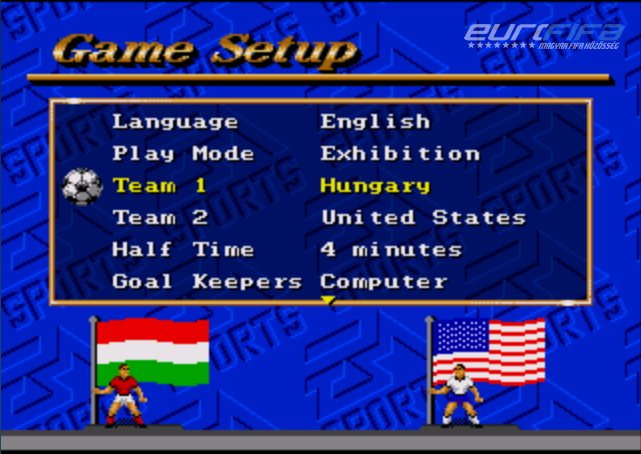 Ezen az oldalon tudjuk kiválasztani a két csapatot, köztük Magyarországot, beállíthatjuk a félidő hosszát, szabálytalanságot, leseket, dönthetünk arról is, hogy mi szeretnénk irányítani a kapusunkat vagy meghagyjuk ezt a számítógépnek. Miután az alap dolgokat beállítottuk, következő lépésben kiválasztjuk, hogy melyik csapattal szeretnénk küzdeni, majd Ron Barr mond nekünk pár szót írásban a két csapatról és a körülményekről.